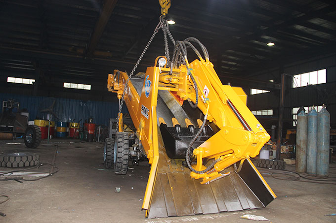 小型轮胎式挖掘装载机(小型蜜桃AV在线观看)是一种连续生产的出矿设备。主要用于空间狭窄的洞采作业,如金属矿,引水巷道等,其作用是采集各工程的碎石土料并输送、装车。本机靠轮胎推进铲取岩石并通过铲斗将石料扒进自身的皮带输送机,输送机从尾部将岩石卸入自卸车、矿车。同时也可利用反铲挖掘臂扒取远处的岩石,也可以用铲斗来清理工作面。适用于断面为2.0米内(1.8*1.8米)的巷道。